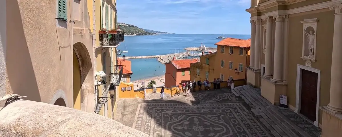 From the top of the yellow stairs and the square of the old town, the view isn’t very wide, but it’s got its own charm. You can catch a glimpse of the sea, the beach, and part of the old port, all nicely framed by the ochre facades lining the view and the side of the basilica. It’s like a little postcard of Menton.